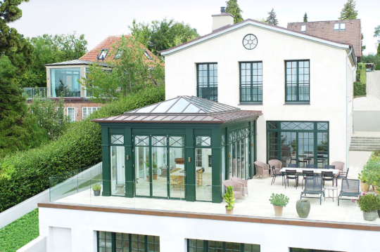 Orangeri med smalle sprosser og glastag bygget i stil med den ældre patriciervilla