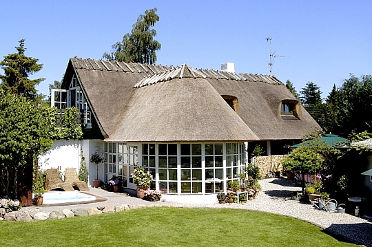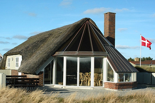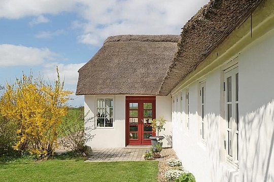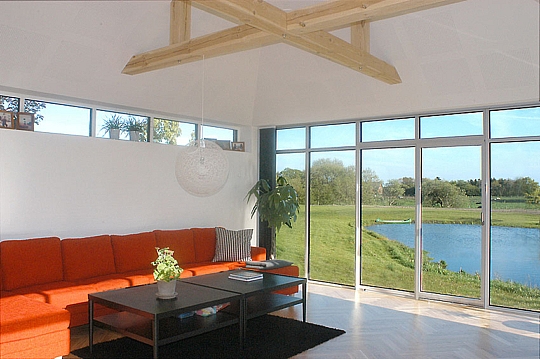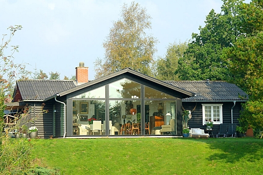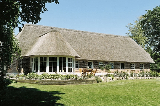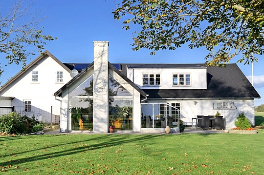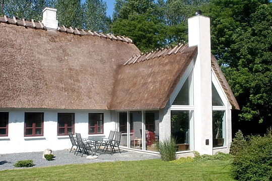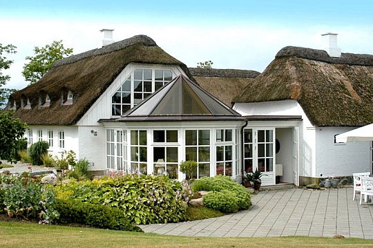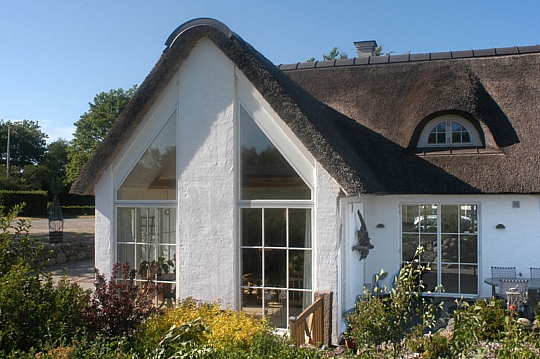 Tilbygning med panoramo vinduer og et moderne udtryk blev det endelige valg til den flotte stråtækte ejendom