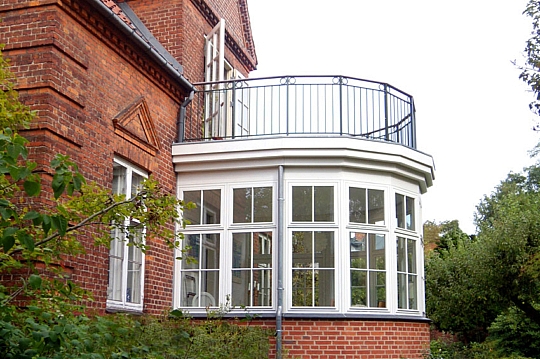 En karnap i gammel stil gjorde stuen i det gamle byhus meget lysere og større. Vinduerne er udført med ægte…