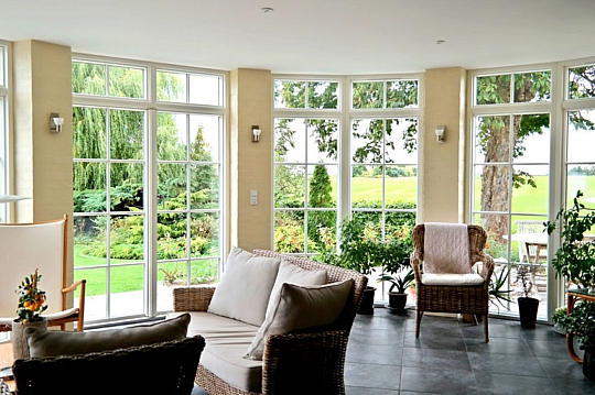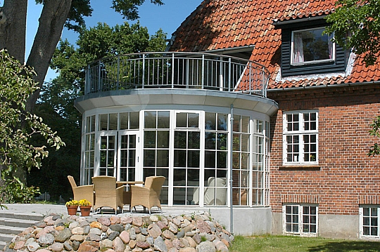 Tilbygning til stuehus på proprietærgården i Næstved er bygget som en gammeldags veranda hvorfra der er udsigt til parken og markerne