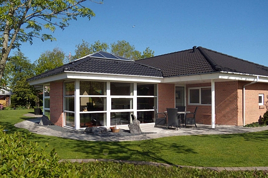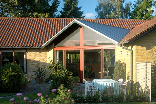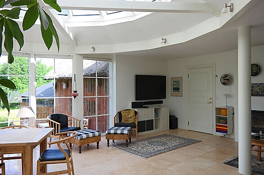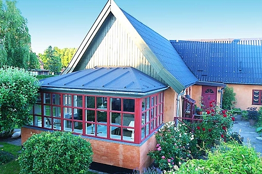 Tilbygningen er bygget som et orangeri og har åbent forbindelse til køkken og stue