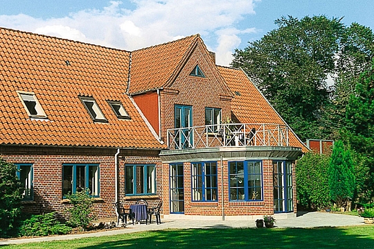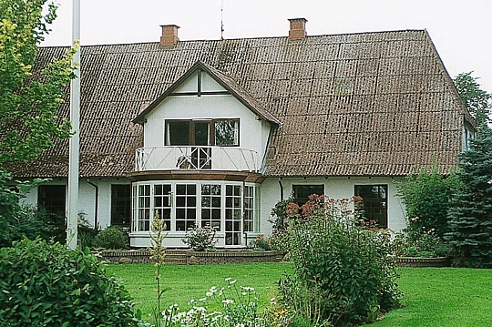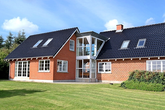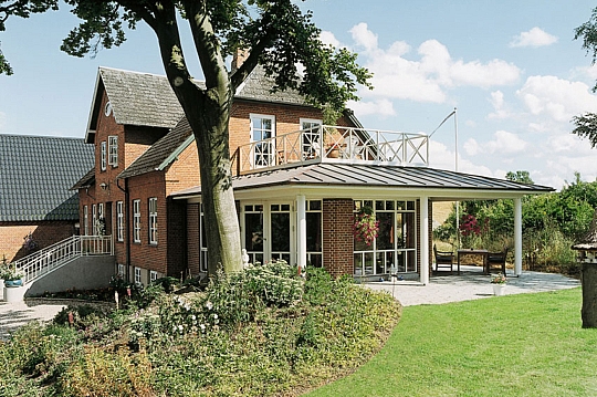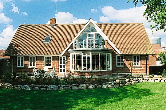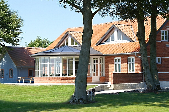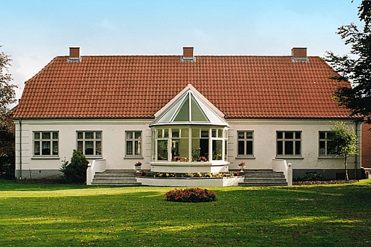 Bygningen er udført som en selvstændig tilbygning som via en glasgang er forbundet med stuehuset. Taget på…