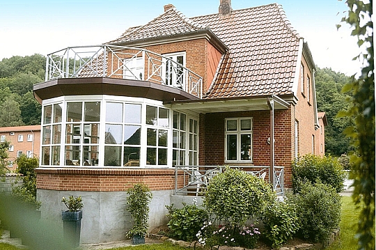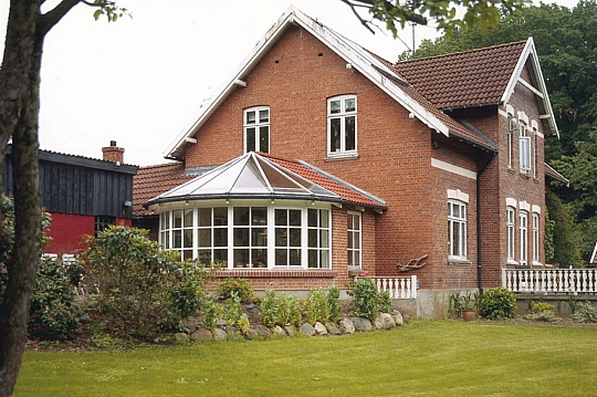 Tilbygning i træ og tegl til villa der er opført i munkesten fra et nedbrudt kloster