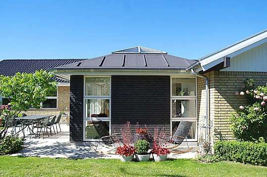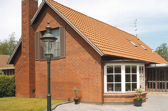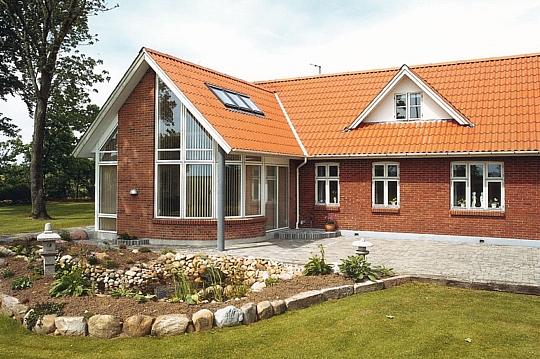 Tilbygningens arkitektur er godt integreret med huset, men også materialerne i form af de gule murstensvægge…