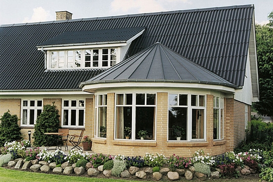 Flot runddel udført med falset zinktag, sprossede kærnetræsvinduer med super-lav-energi glas (U – værdi 1,1)…