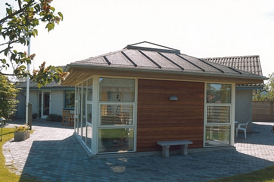 Tilbygning på sommerhus, hvor den arkitektoniske idé kommer i sit rette element. Bygningen er opført i en halvcirkel…