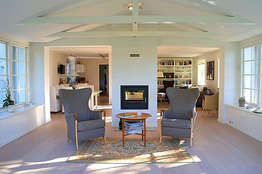 Vinkelbygning opført i harmoni med utraditionelt hus. Hvidpigmenteret rustiklofter er ført til kip, hvor…