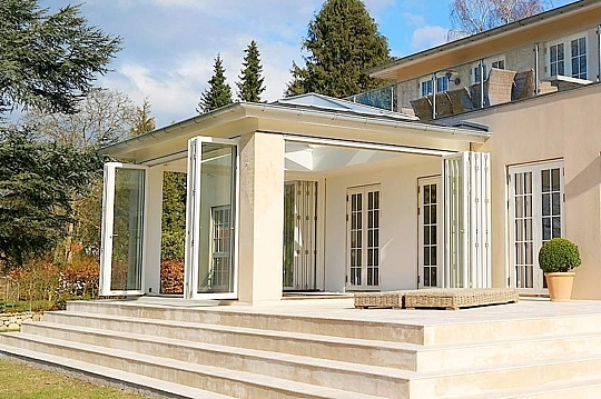 Tilbygninger med store foldedørs åbninger kan bruges både som orangeri og overdækket terrasse.