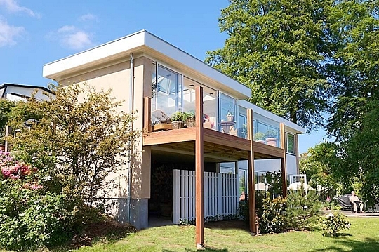 Tilbygning med udsigt og store skydedøre med udgang til hævet terrasse rundt om tilbygningen
