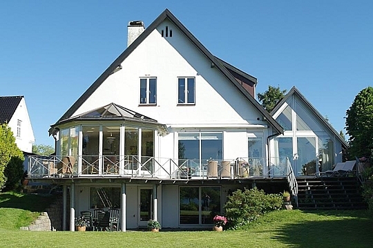 Flot runddel med sprossede kernetræsvinduer der er industrilakeret hvide Taget er udført med synlige…