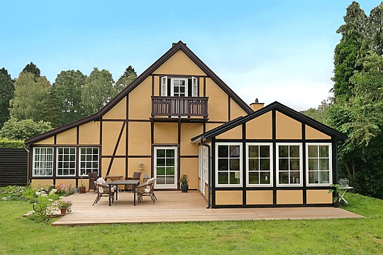 Ny orangeri til ældre bindingsværkshus bruges som en tilbygning der forbinder huset med udhuset