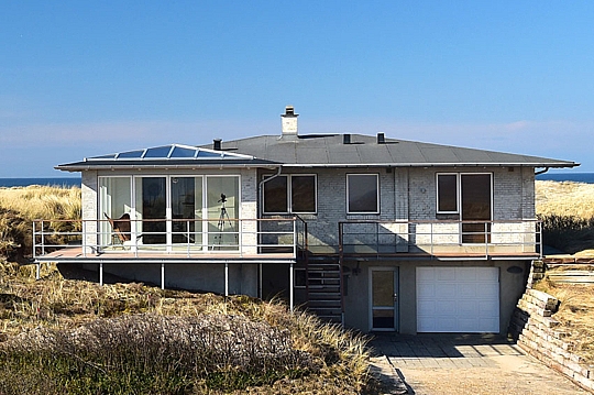 Rå tilbygning i glas, træ, stål og beton til sommerhus beliggende i råt vestjysk klitlandskab med udsigt over hav og fjord