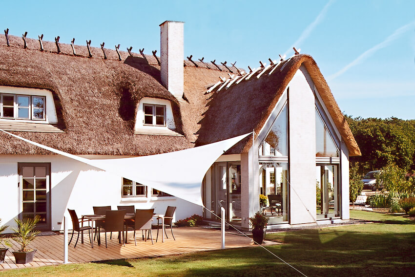 Tilbygning med store panoramo vinduer og et moderne udtryk blev det endelige valg til til den flotte stråtækte ejendom